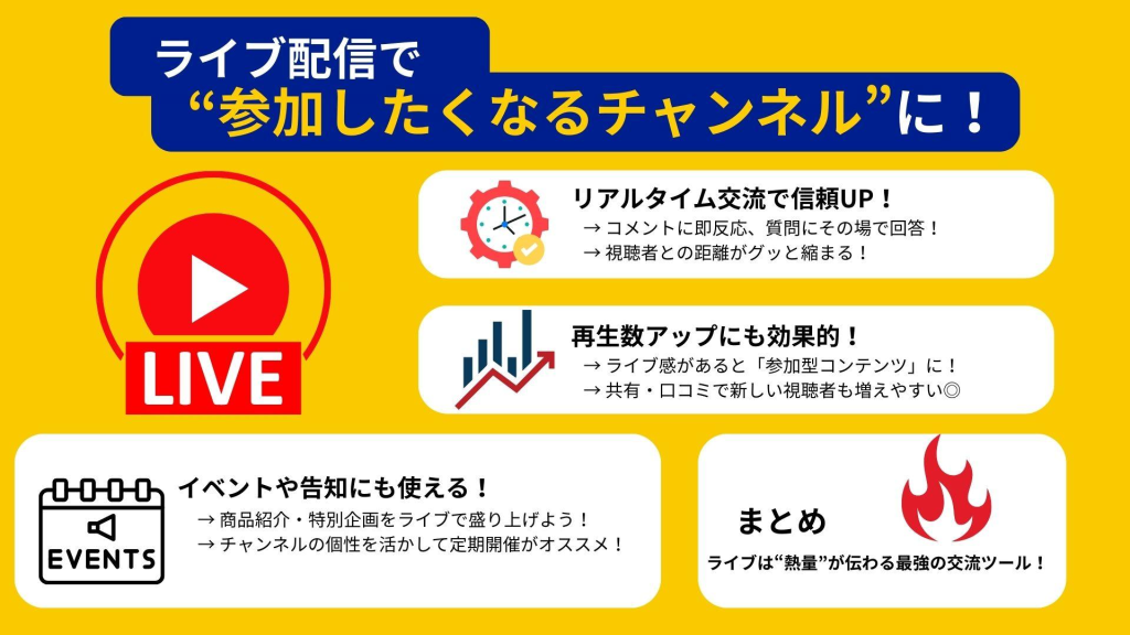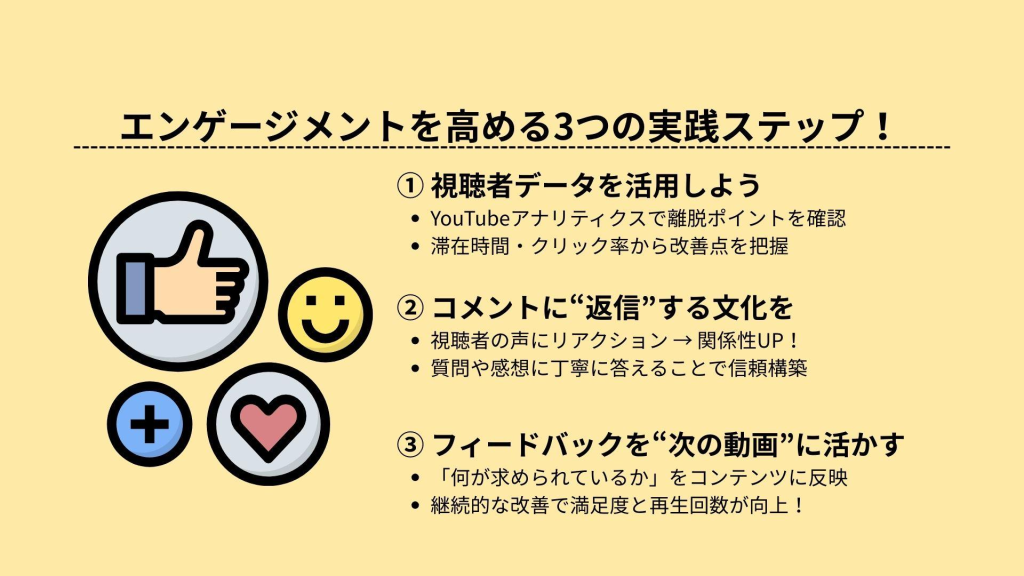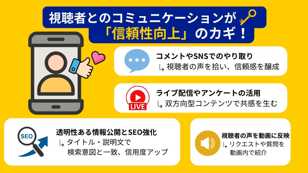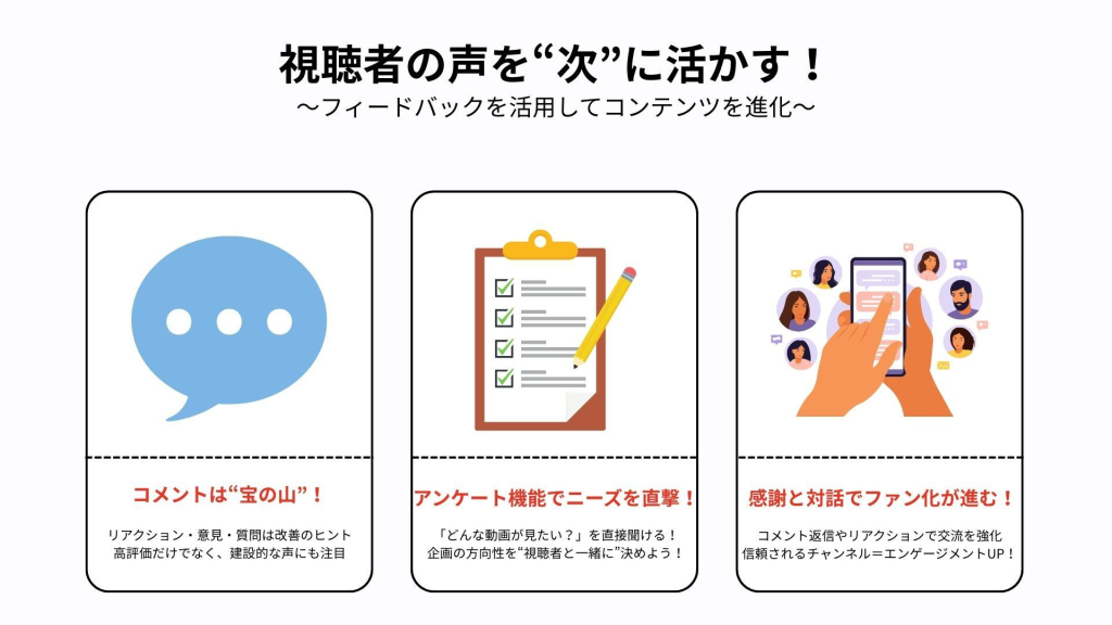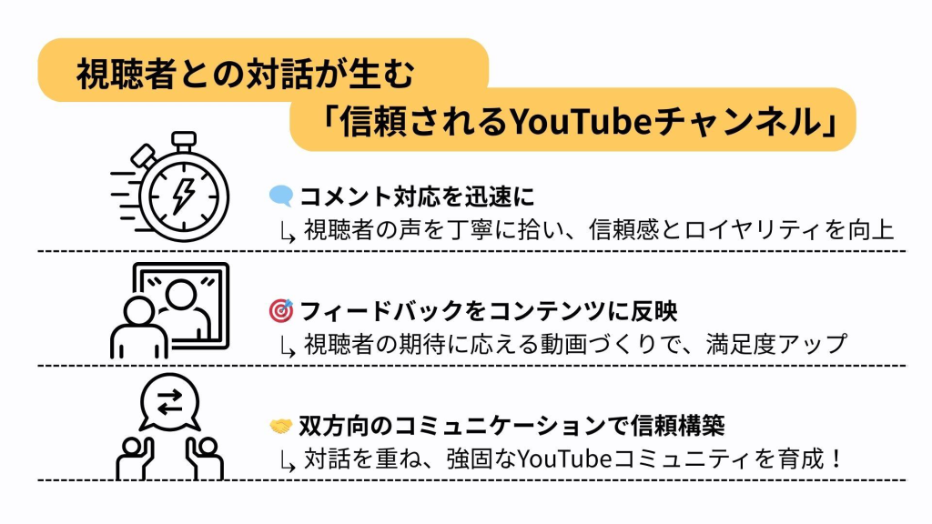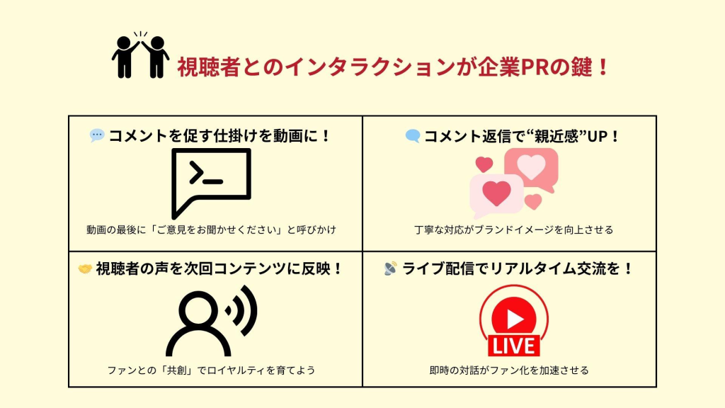 視聴者とのインタラクションを促進することは、YouTubeでの企業PRを成功させるカギです。動画の最後には視聴者にコメントを促す呼びかけを入れたり、質問を投げかけて意見を求めるようにしましょう。また、受け取ったコメントには迅速かつ丁寧な返信をすることで企業の親近感を高め、信頼を築きます。さらに、視聴者の意見を次回のコンテンツ制作に反映させることで、ユーザー参加型のコミュニティを醸成します。ライブストリーミングを導入するのも有効で、リアルタイムで視聴者とコミュニケーションを図れる機会を増やします。こうした工夫により、視聴者が積極的に参加するチャンネルに成長させることが可能です。