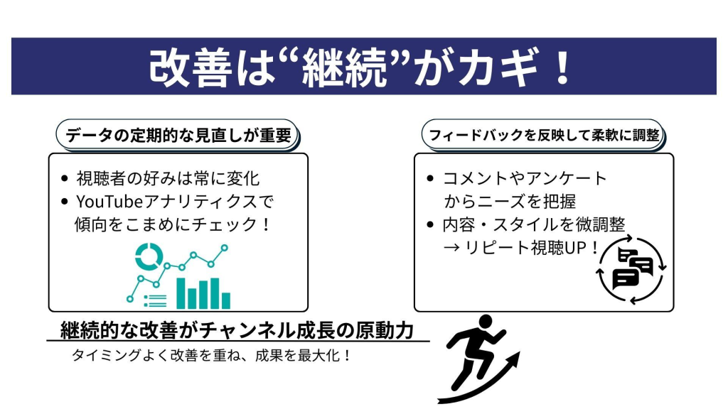 効果的なチャンネル管理には、定期的なコンテンツの更新とパフォーマンス分析が必要です。YouTubeのアナリティクスを活用し、視聴者の傾向を把握しましょう。これにより、どの動画が視聴者に最も響いているのかを理解し、次回のコンテンツ制作に役立てます。また、コンテンツカレンダーを作成して、計画的に動画の公開スケジュールを管理することも効果的です。これにより、視聴者は常に新鮮な情報を手に入れることができ、企業のYouTubeチャンネルに対する関心を維持することができます。定期的に更新されるコンテンツは、YouTubeアルゴリズムにも好まれ、検索結果で上位に表示されやすくなるため、自然な形で視聴者を増やすことが可能です。