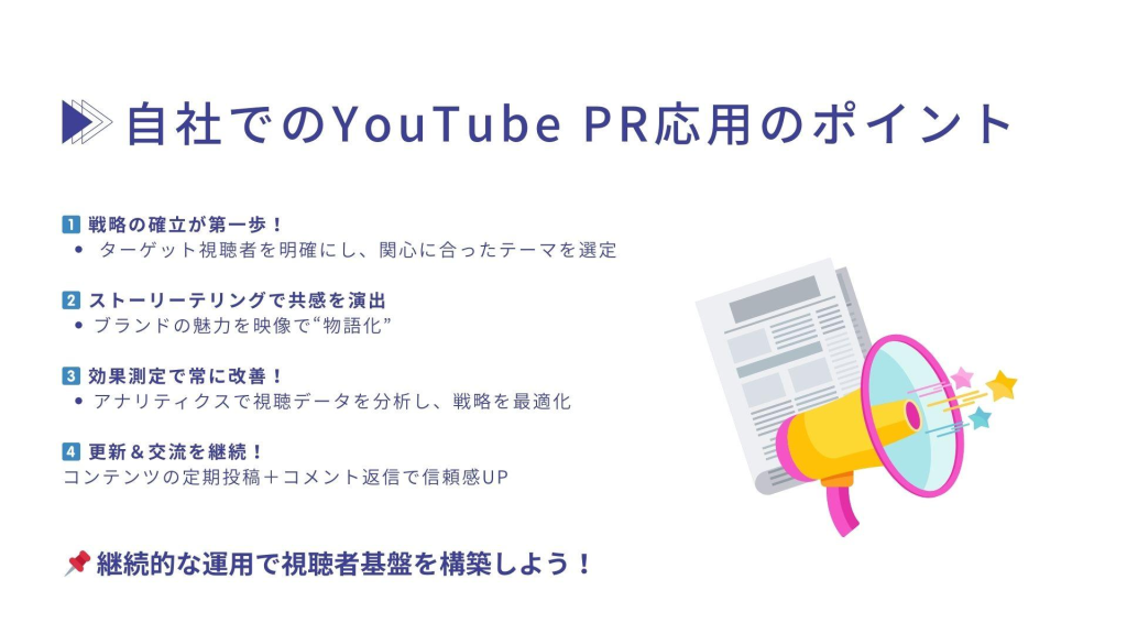 自社での応用には、まず明確なYouTube PR戦略を確立することが必要です。ターゲット視聴者を深く理解し、視聴者の関心を引くコンテンツテーマを選定します。制作過程では、ストーリーテリングの技術を駆使して、視聴者の共感を呼ぶ映像を作成しましょう。また、視聴データを活用し、動画の効果を定期的に測定しましょう。これにより、YouTube PR効果測定が可能となり、最適な戦略の調整ができます。結果として、効果的なチャンネル運営とブランドの認知度向上に寄与します。定期的なコンテンツの更新と、コメントセクションでの視聴者との交流も重要です。これにより、YouTubeチャンネルの企業利用を最大化し、持続的な視聴者基盤を構築できます。