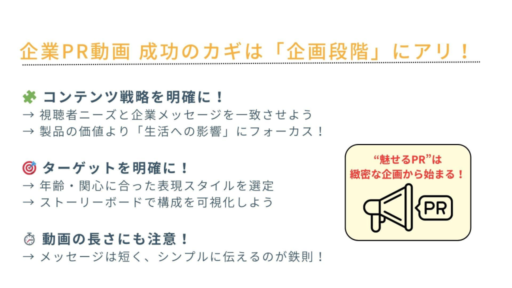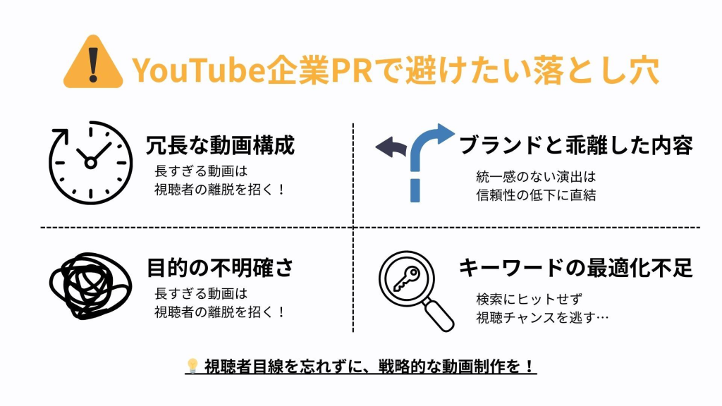YouTubeを活用した企業PRは、効果的なブランディングと集客力の向上を実現する強力なツールです。しかし、成功するためには適切な戦略と注意点を把握し、問題が発生した場合には素早く改善策を講じることが求められます。以下では、YouTube活用マーケティングを考慮したPR動画制作の重要なポイントを詳しく解説します。