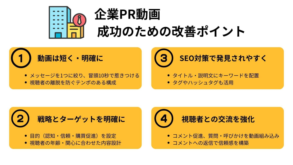 企業PR動画作成における問題を解決するためには、いくつかの改善策を実施することが有効です。まず、動画の長さはできるだけ短く、濃縮したメッセージを伝えられるようにします。効果的なPR戦略を確立し、明確な目標とターゲットオーディエンスを設定することで、ブランディングと情報伝達の一貫性を保つことが重要です。また、YouTubeチャンネル企業利用の場合には、効果的なSEO対策を施し、関連キーワードを説明文やタグに組み込むことで、検索エンジンでの可視性を向上させます。さらに、視聴者参加を促進する呼びかけやコメント機能を活用し、インタラクションを増やすことで視聴者の関心を維持します。これらの改善策によりYouTube PR効果測定が容易になり、企業のYouTubeプラットフォーム制作戦略が強化されます。