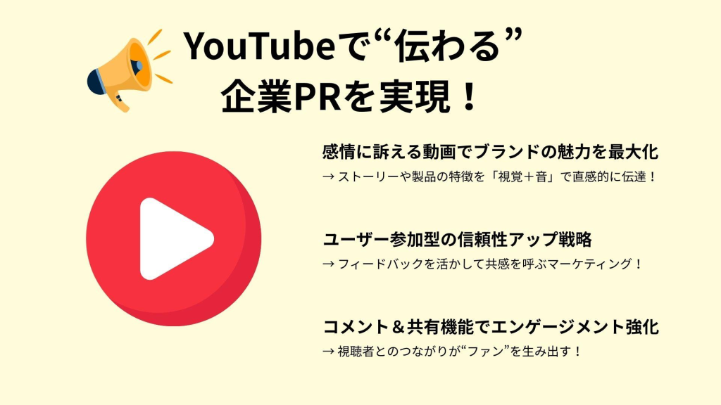 企業がYouTubeをPRに利用する最大のメリットは、視覚的かつ感情に訴える力が強化される点です。YouTubeの動画は、ブランドストーリーやプロダクトの魅力を視聴者に直接伝えるのに最適です。例えば、「YouTube 活用 マーケティング」方法を駆使すると、製品紹介だけでなく、ユーザーからのフィードバックを積極的に取り入れることで、信頼性の高いコンテンツを生み出すことが可能になります。また、YouTubeのコメント機能や共有機能を活用することで、視聴者とのエンゲージメントを高め、ファンベースを構築することもできます。このように、YouTubeを活用することで、広範なオーディエンスにリーチできるだけでなく、深い顧客関係を構築しやすくなるのです。
