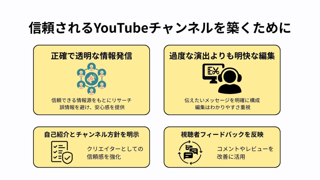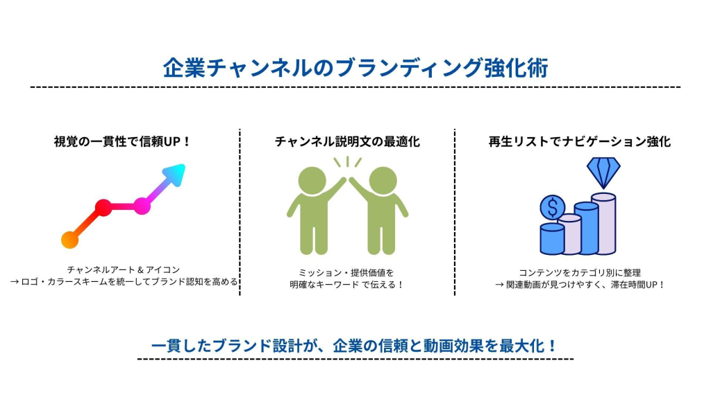 企業チャンネルのブランディングは、視覚的な一貫性と情報の信頼性を確保するために極めて重要です。まず、チャンネルアートとアイコンのデザインは企業のロゴとカラースキームに合わせて統一することで、ブランド認知を高めます。また、チャンネル説明文には企業のミッションや提供する価値を明確に伝えるキーワードを盛り込みましょう。さらに、再生リストを活用して異なるコンテンツカテゴリーを整理し、訪問者が簡単に関連する動画を見つけられるようにします。このように一貫したブランディングを行うことで、視聴者はチャンネル全体に対する信頼感を持ち、企業PR動画の効果を最大化することができます。