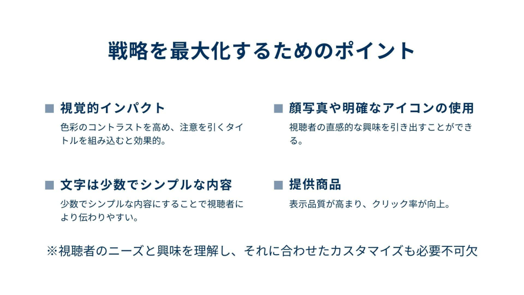 成功した企業に共通するのは、ターゲットオーディエンスを明確にし、そのニーズに応えるコンテンツを提供している点です。商品情報だけでなく、顧客のライフスタイルに寄り添ったストーリーを展開することで、再生回数の増加だけでなく、視聴者のエンゲージメントを向上しています。また、特定のターゲットに向けた広告キャンペーンを組み合わせることで、PR動画のReachを最大化しています。これにより、YouTube PR動画の「視聴から購買」への誘導も効率的に行われています。測定可能なKPI設定により、キャンペーンの効果を継続的に見直し、改善している点も見逃せません。