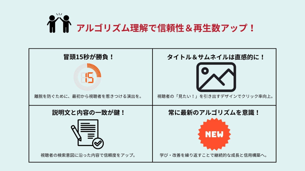 集めたデータを活かし、効果的なPR戦略を展開するには、データの活用方法がポイントです。例えば、視聴者の傾向や嗜好を分析し、ターゲット層がどのようなコンテンツに興味を持っているのかを理解することは非常に重要です。そのためには、YouTubeアナリティクスの視聴者層のデータを元に、視聴者の地域、性別、年齢層を詳細に調べ、よりターゲットに即した動画内容の検討やタイトル、サムネイルの改善を図る必要があります。さらに、YouTubeのアルゴリズムを理解し、関連動画やお勧め動画に出やすいテーマ選びや、SEO対策を通じてチャンネルの露出を増やすことも賢明です。こうした施策を組み合わせることで、YouTube 企業 PR 方法を最大限に活用し、視聴者獲得へと結びつけることが可能になります。