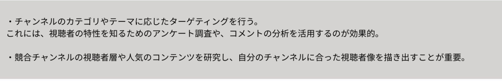 YouTube チャンネル リサーチ 方法として、これらのデータを基にターゲットを明確にすることで、より多くの視聴者を引きつけ、維持することができます。